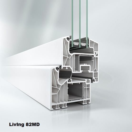 Mit dem Kunststoff-System Schüco LivIng setzt Schüco in puncto Energieeffizienz Maßstäbe bei stahlarmierten Profilsystemen. Das innovative 7-Kammer-System, das dank der Twin-Systemtechnologie sowohl mit Anschlag- als auch mit Mitteldichtung gebaut werden kann, erreicht mit einer Bautiefe von 82 mm hervorragende Wärmedämmwerte. Als Mitteldichtungssystem lassen sich so ohne aufwändige Zusatzmaßnahmen auch Passivhäuser realisieren.