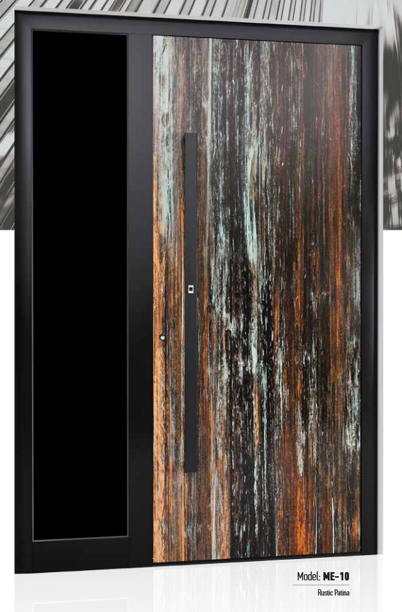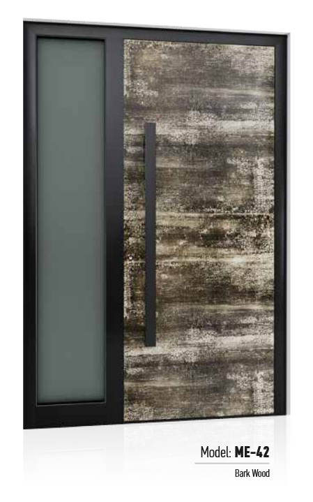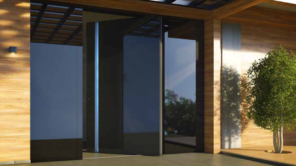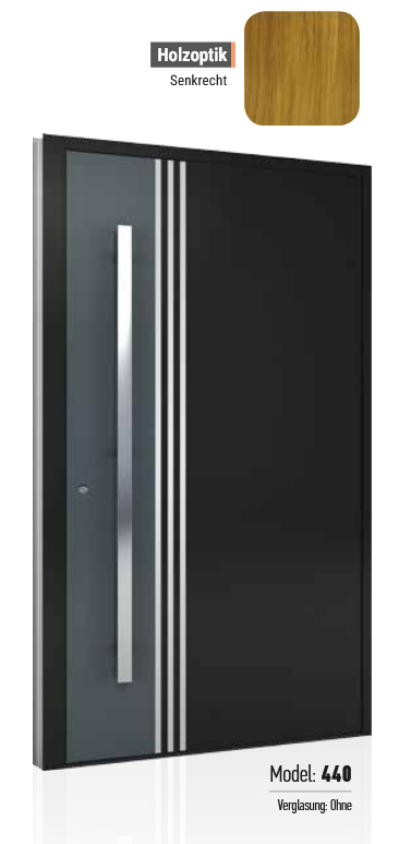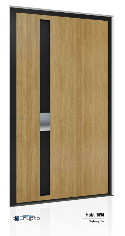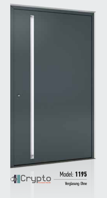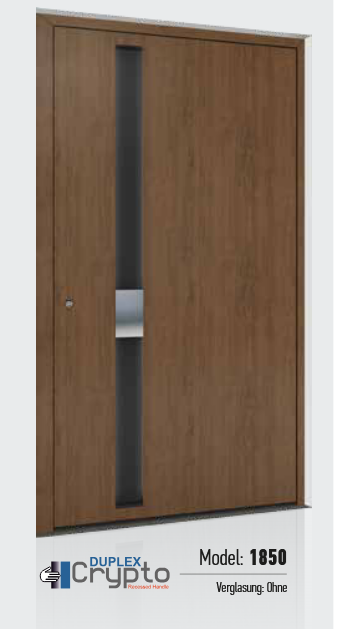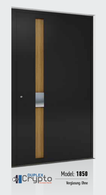 Oberfläche mit Aluminium in Farbe „dunkle-'' schwarze Holzoptik '' Innenliegender Crypto“-Außengriff und klares Glas.